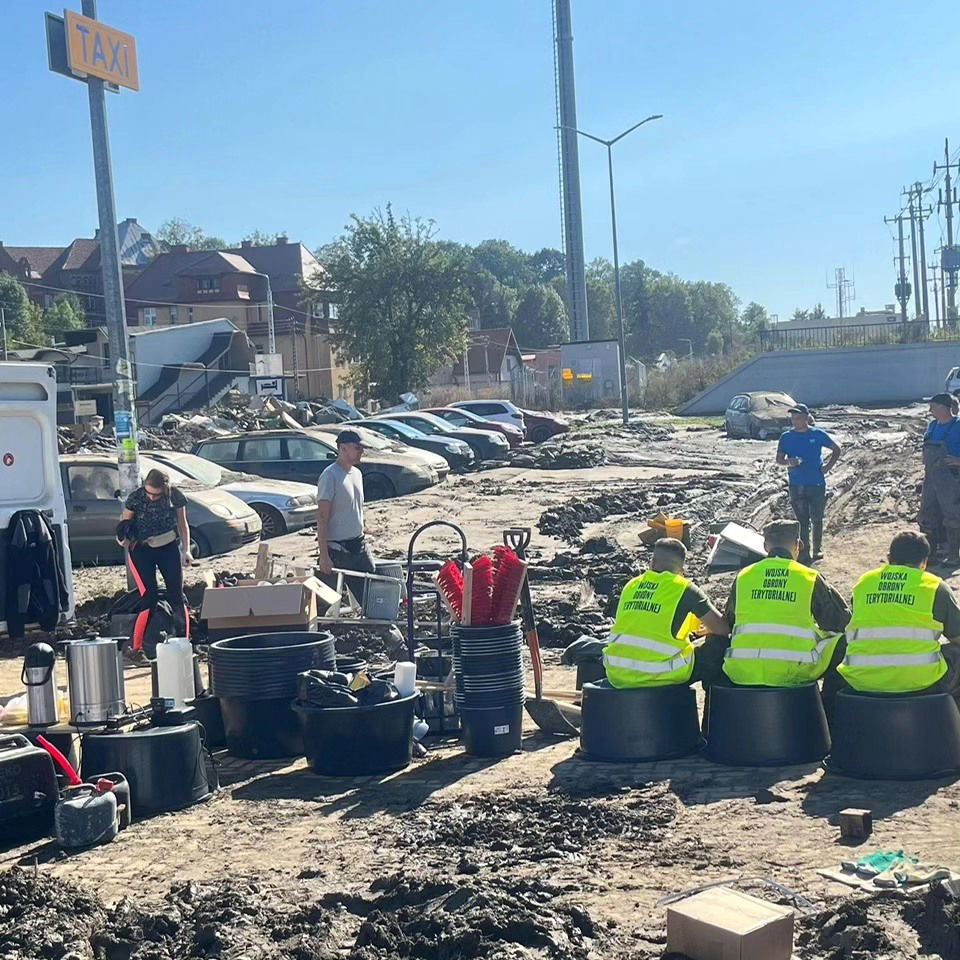 Gut vorbereitet mit einem Minibagger sowie Eimer, Besen, Müllsäcke Schaufeln und Handschuhe sind sie nach Klodzko in Südpolen gefahren, um einerseits tatkräftig beim Entkernen der überschwemmten Häuser zu helfen, aber auch um die Hilfe vor Ort zu koordinieren. Dazu installierten Sie z.B. einen Sammelpunkt für private und staatliche Helfer, um diese mit warmen Mahlzeiten, Tee und Kaffee zu versorgen.